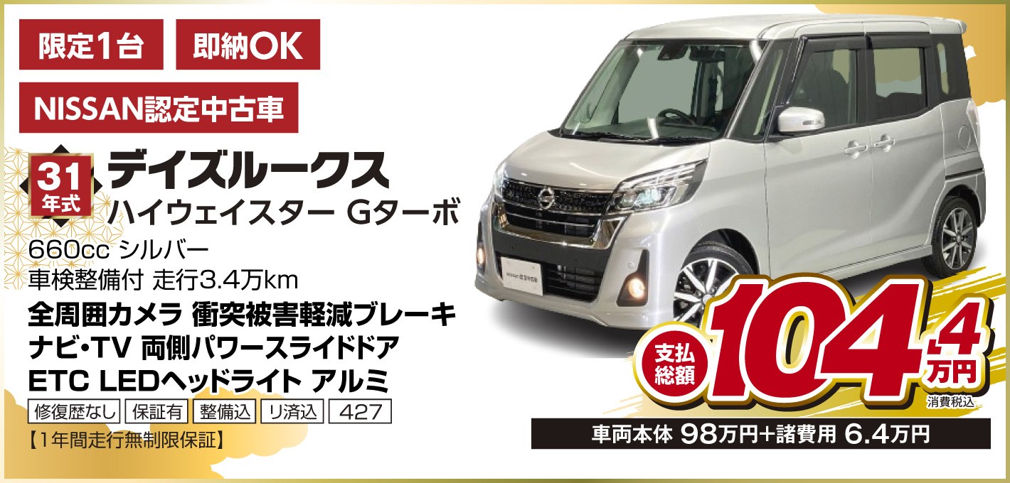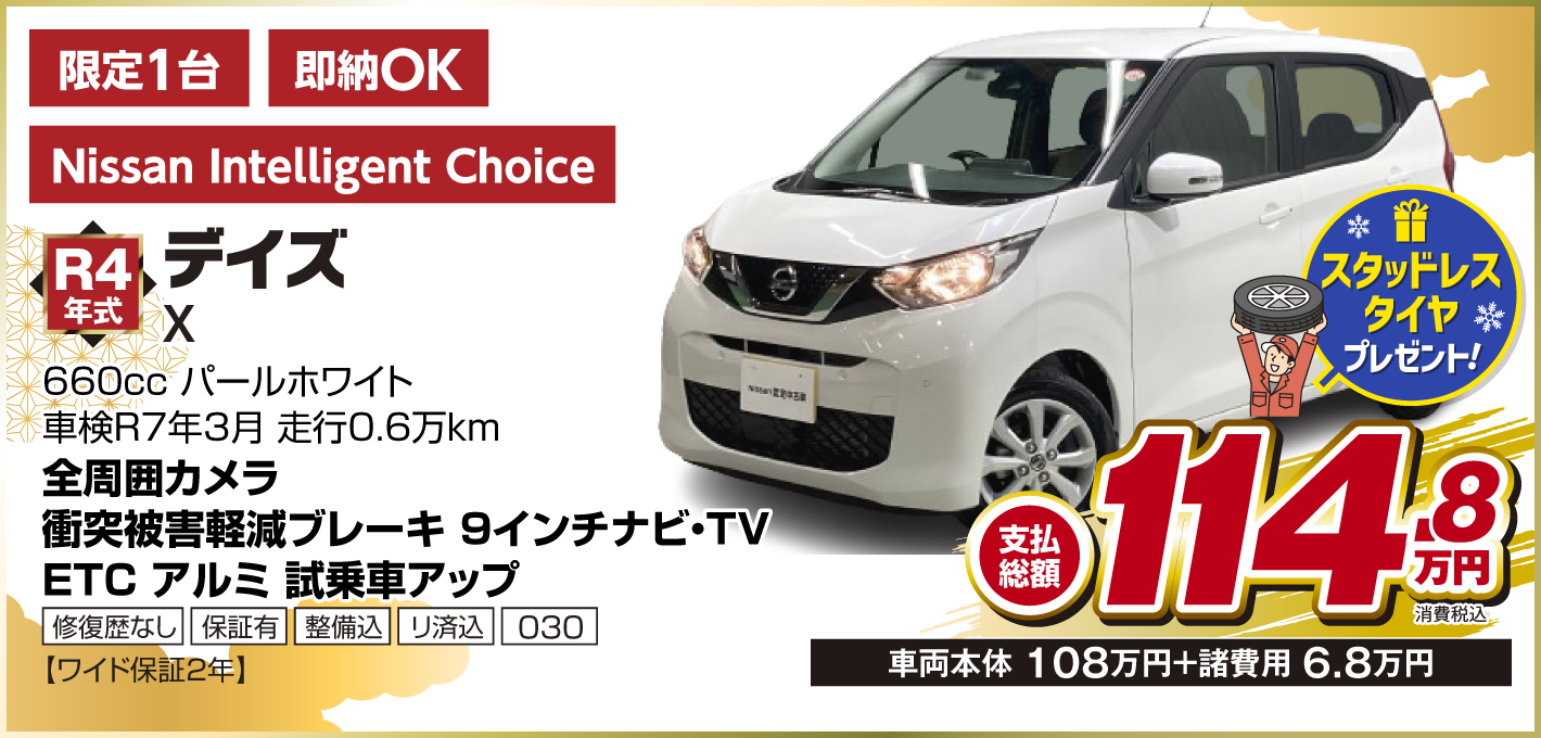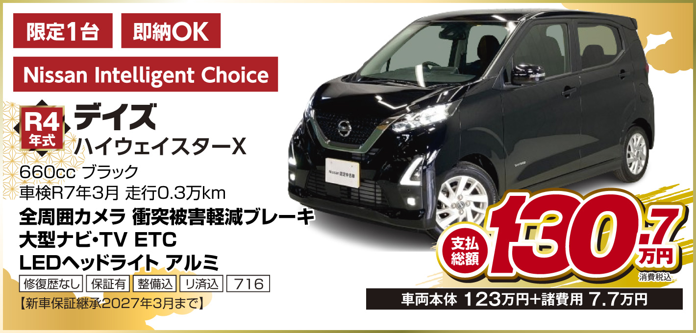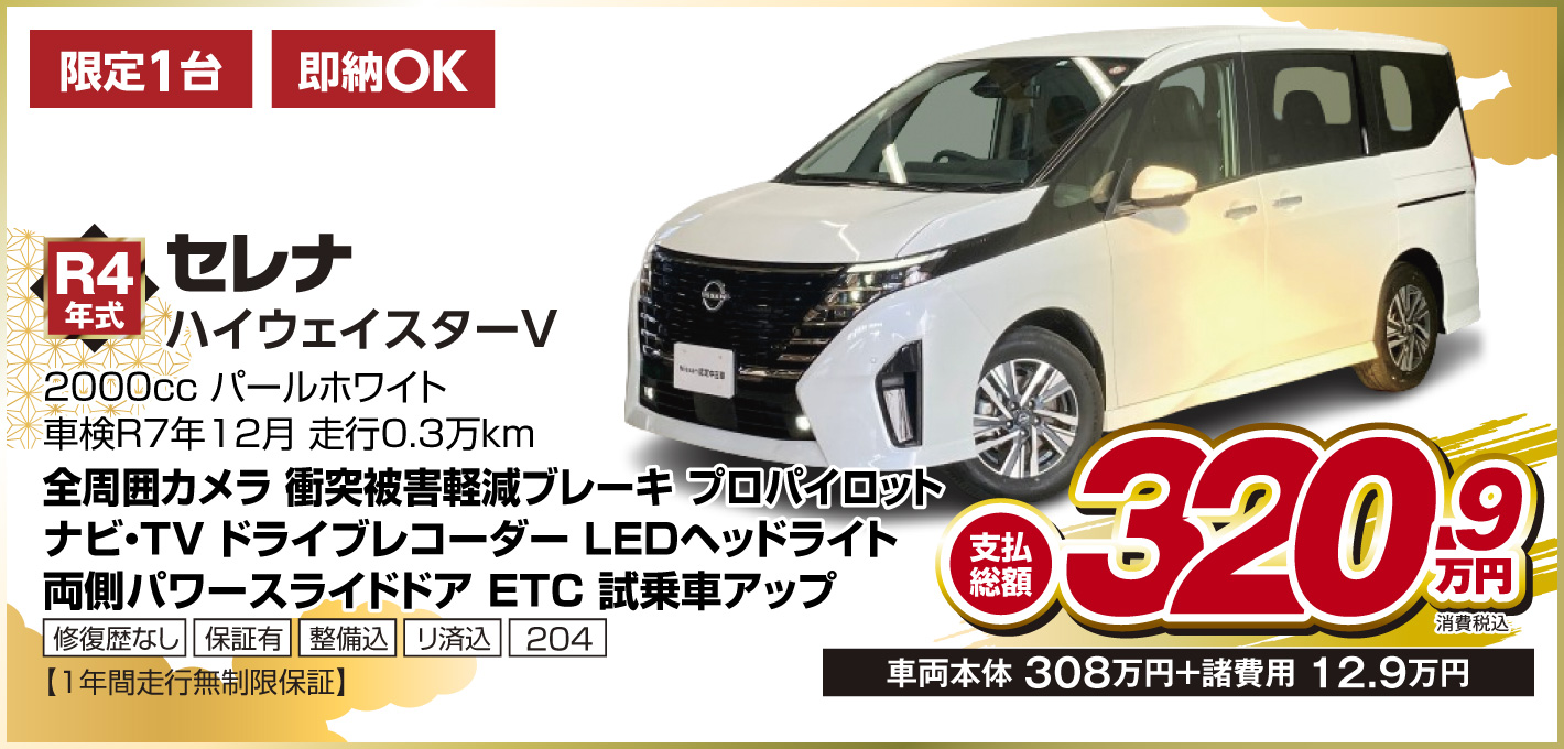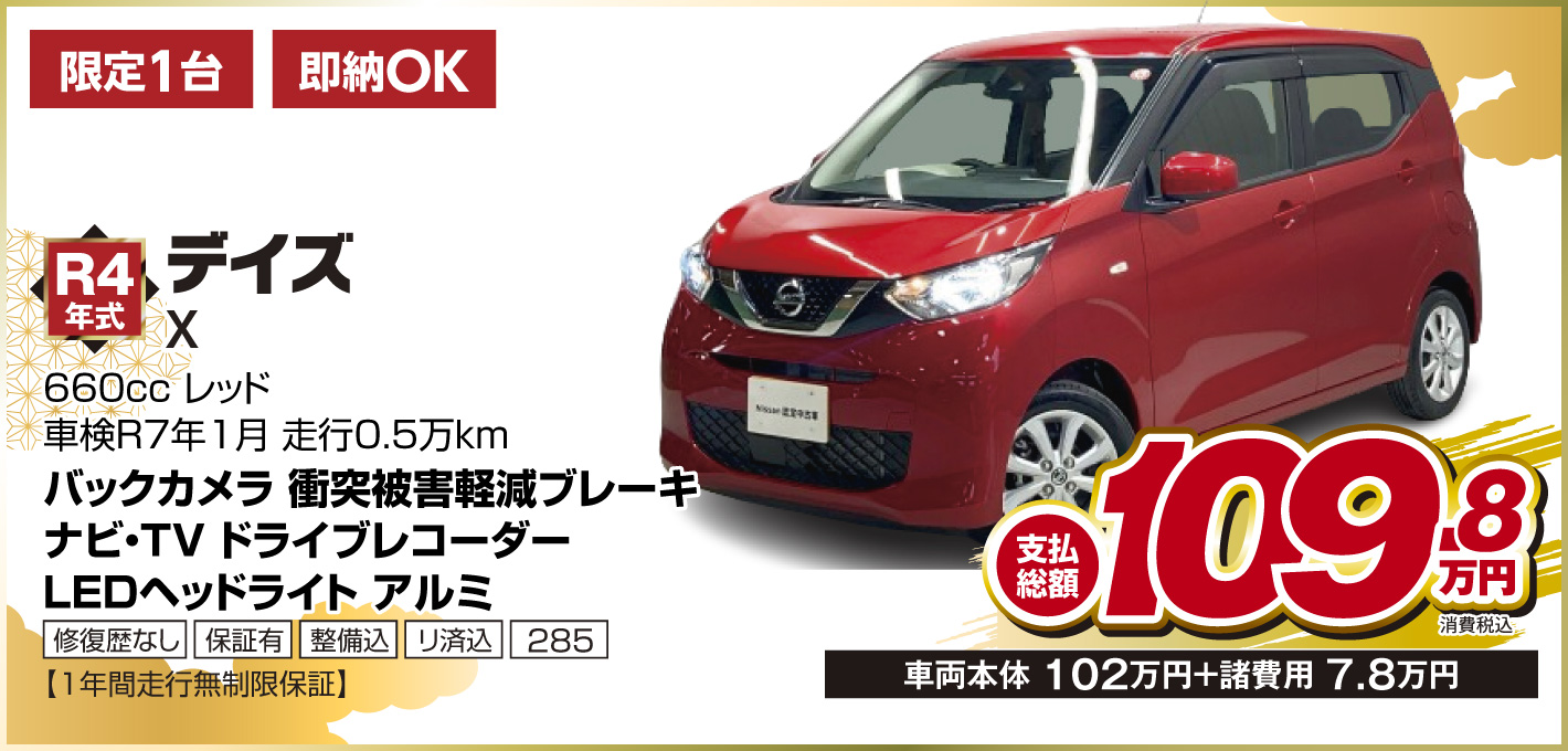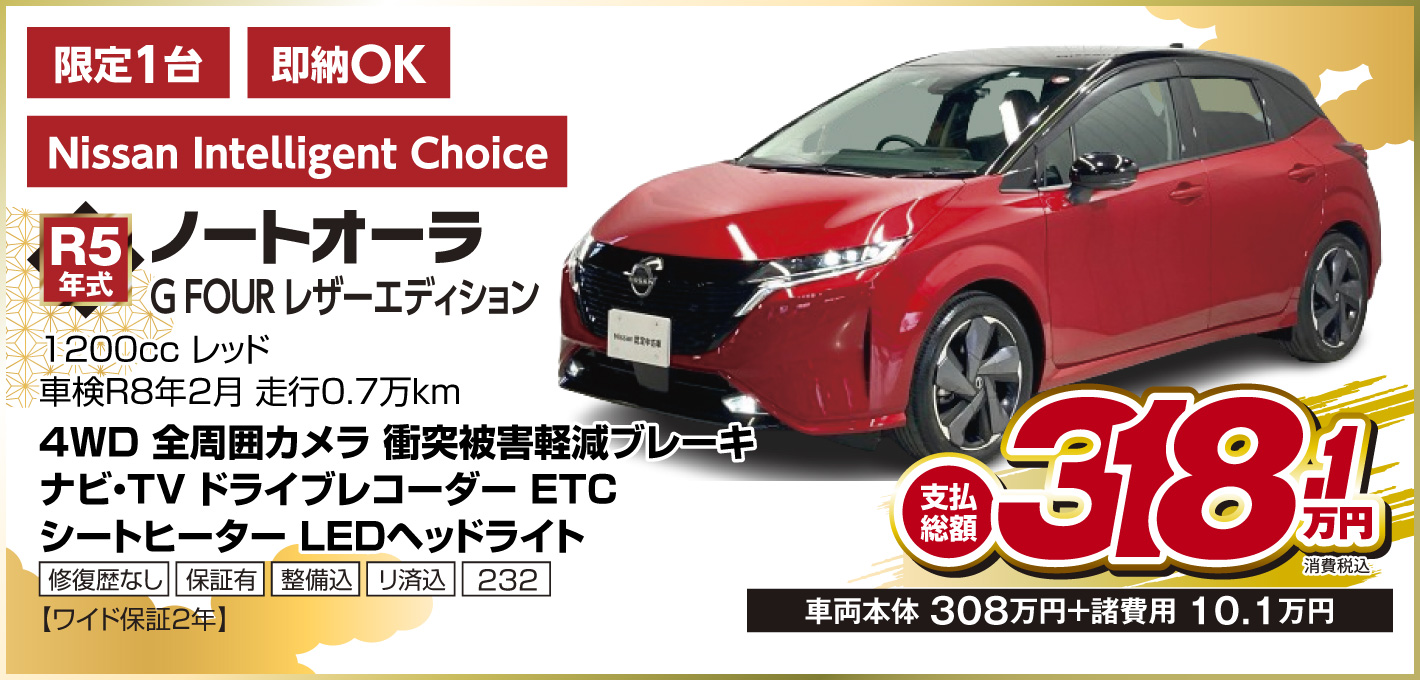 ■支払総額には、車両価格の他・保険料・税金・登録等に伴う費用、リサイクル預託金相当額等、購入時に必要なすべての費用が含まれています。■支払総額は2023年12月現在、県内登録(届出)で店頭納車の場合の価格です。環境性能割等税率変更あった場合、諸費⽤(⽀払総額)は変動する場合がございます。■お客様の要望に基づくオプション等の費用は別途申し受けます。■掲載の車両以外にも展示いたしておりますので、お気軽にお越し下さい。※尚、2023年12月21日(木)現在の在庫車です。WEBページ制作中の売却の節はご容赦下さい。■リサイクル法注記〔リ済込〕リサイクル料金が預託済みで、支払総額に含まれている。■〔整備無〕…定期点検整備を行っていません。〔整備込〕納車時に定期点検整備を実施。整備費用は販売価格に含まれています。■〔保証無〕保証がついていません。〔整備有〕保証がついています。期間は、車両情報と共に記載しています。保証内容につきましては対象外部品がありますので、詳しくは係員にお尋ねください。■表示されている番号は車体番号の下3桁の数です。(例:123)■〔修復歴あり〕修復歴の部位についてはスタッフにお尋ね下さい。〔修復歴なし〕修復歴がありません。■掲載車両の写真は撮影及び表示環境により、実物と異なって見える場合がございます。■十分注意しておりますが、広告に万一ミスがございました節は誠に恐縮ですがご容赦下さい。