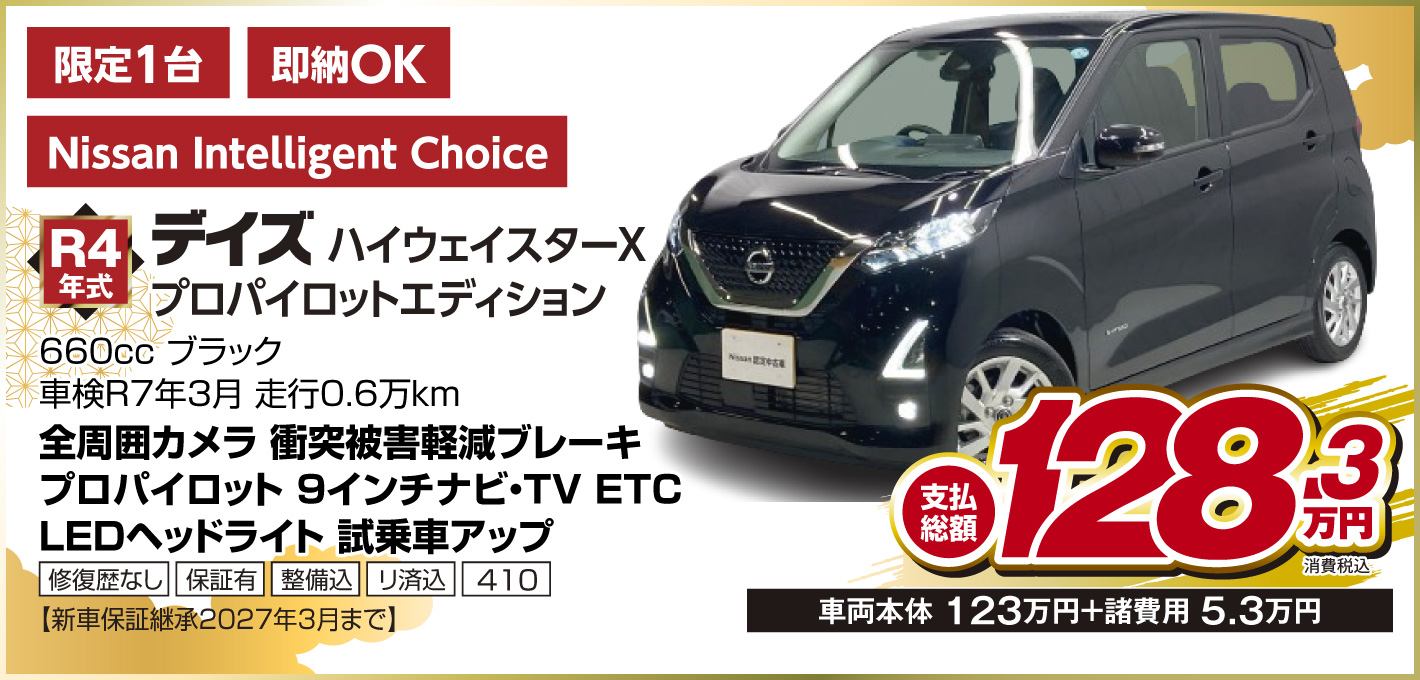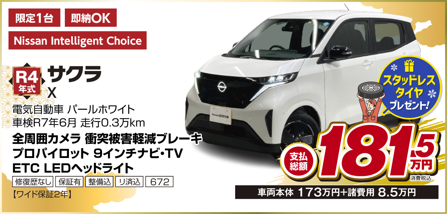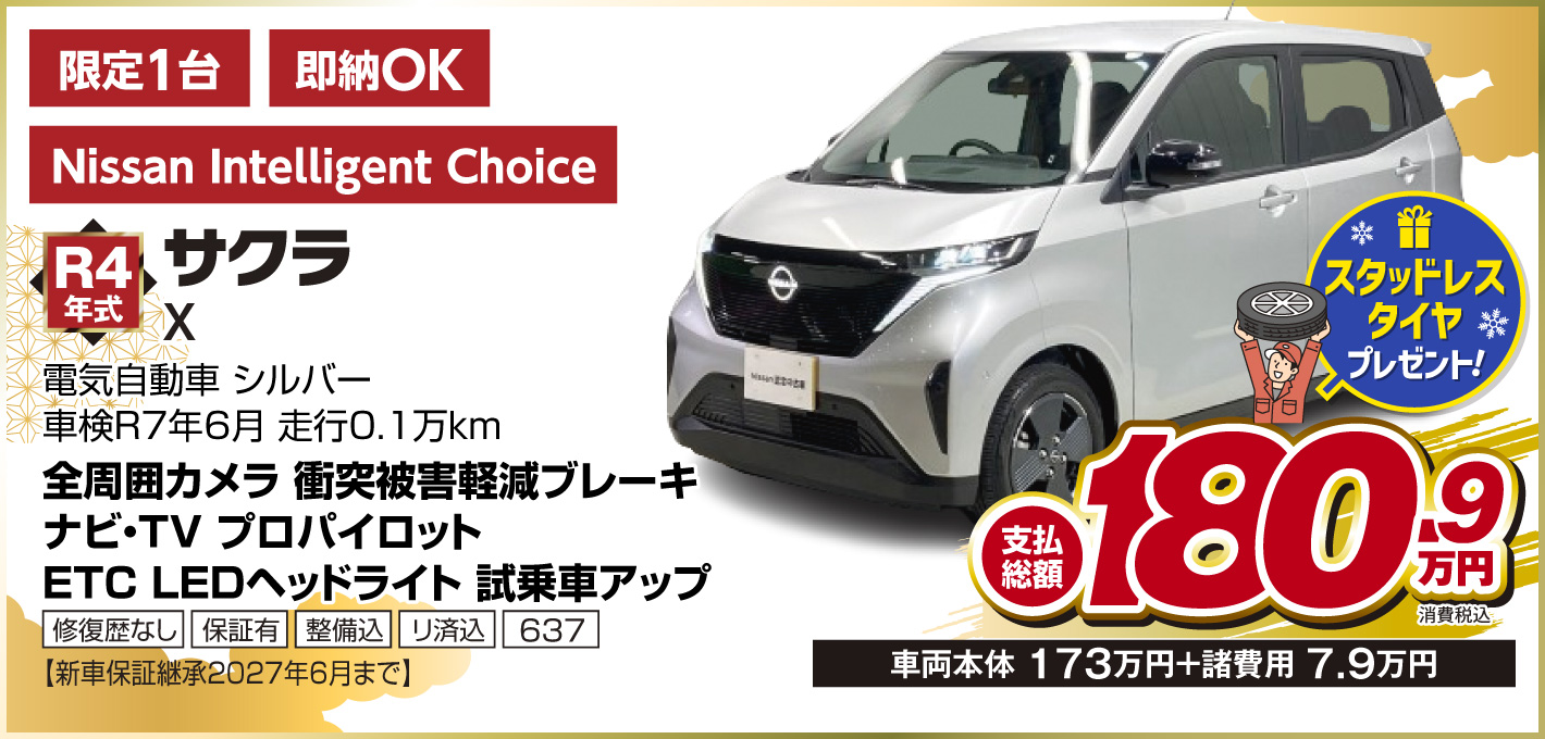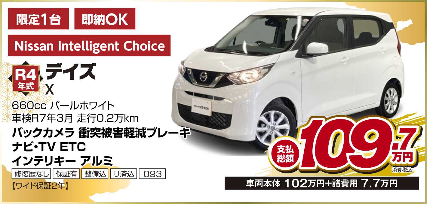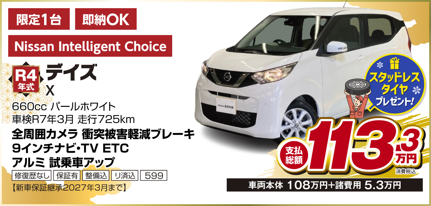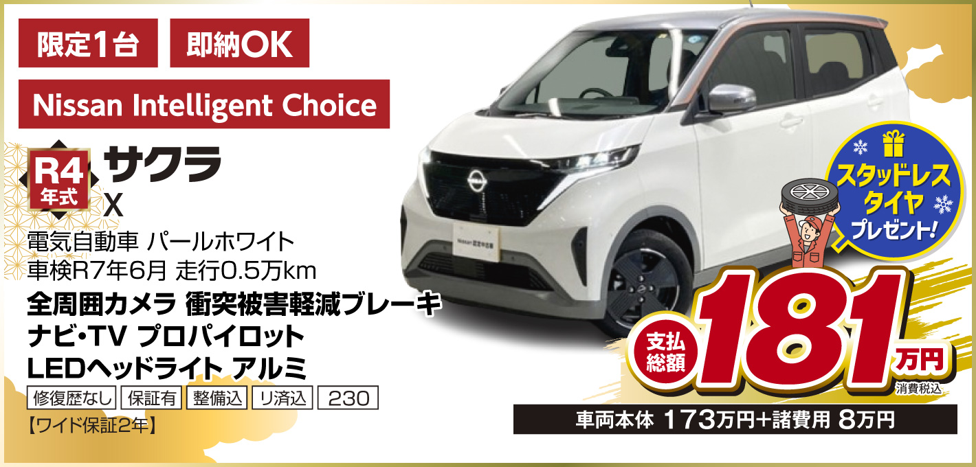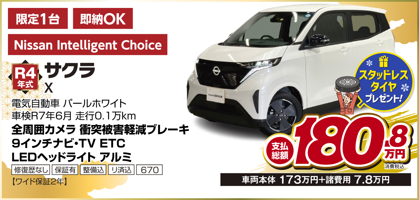 ■支払総額には、車両価格の他・保険料・税金・登録等に伴う費用、リサイクル預託金相当額等、購入時に必要なすべての費用が含まれています。■支払総額は2023年12月現在、県内登録(届出)で店頭納車の場合の価格です。環境性能割等税率変更あった場合、諸費⽤(⽀払総額)は変動する場合がございます。■お客様の要望に基づくオプション等の費用は別途申し受けます。■掲載の車両以外にも展示いたしておりますので、お気軽にお越し下さい。※尚、2023年12月21日(木)現在の在庫車です。WEBページ制作中の売却の節はご容赦下さい。■リサイクル法注記〔リ済込〕リサイクル料金が預託済みで、支払総額に含まれている。■〔整備無〕…定期点検整備を行っていません。〔整備込〕納車時に定期点検整備を実施。整備費用は販売価格に含まれています。■〔保証無〕保証がついていません。〔整備有〕保証がついています。期間は、車両情報と共に記載しています。保証内容につきましては対象外部品がありますので、詳しくは係員にお尋ねください。■表示されている番号は車体番号の下3桁の数です。(例:123)■〔修復歴あり〕修復歴の部位についてはスタッフにお尋ね下さい。〔修復歴なし〕修復歴がありません。■掲載車両の写真は撮影及び表示環境により、実物と異なって見える場合がございます。■十分注意しておりますが、広告に万一ミスがございました節は誠に恐縮ですがご容赦下さい。