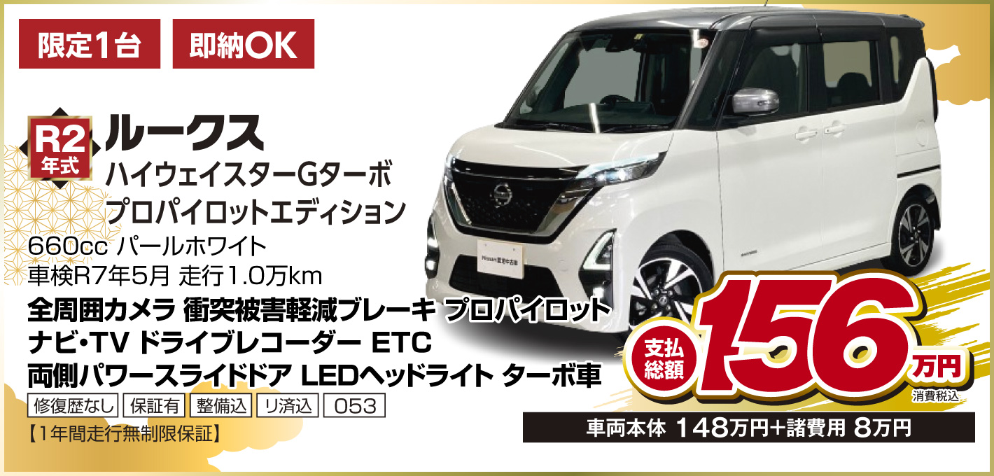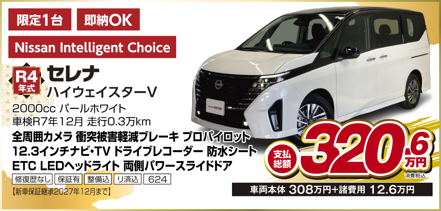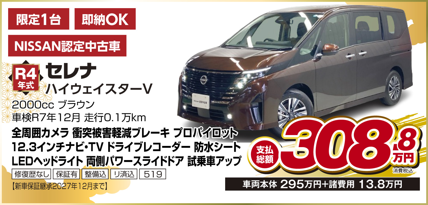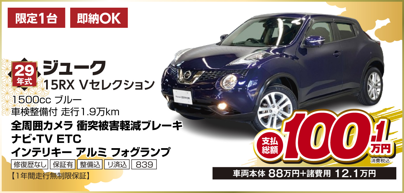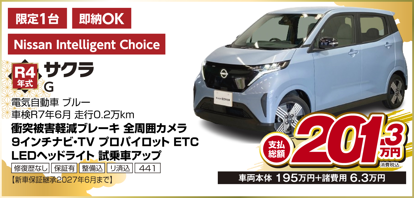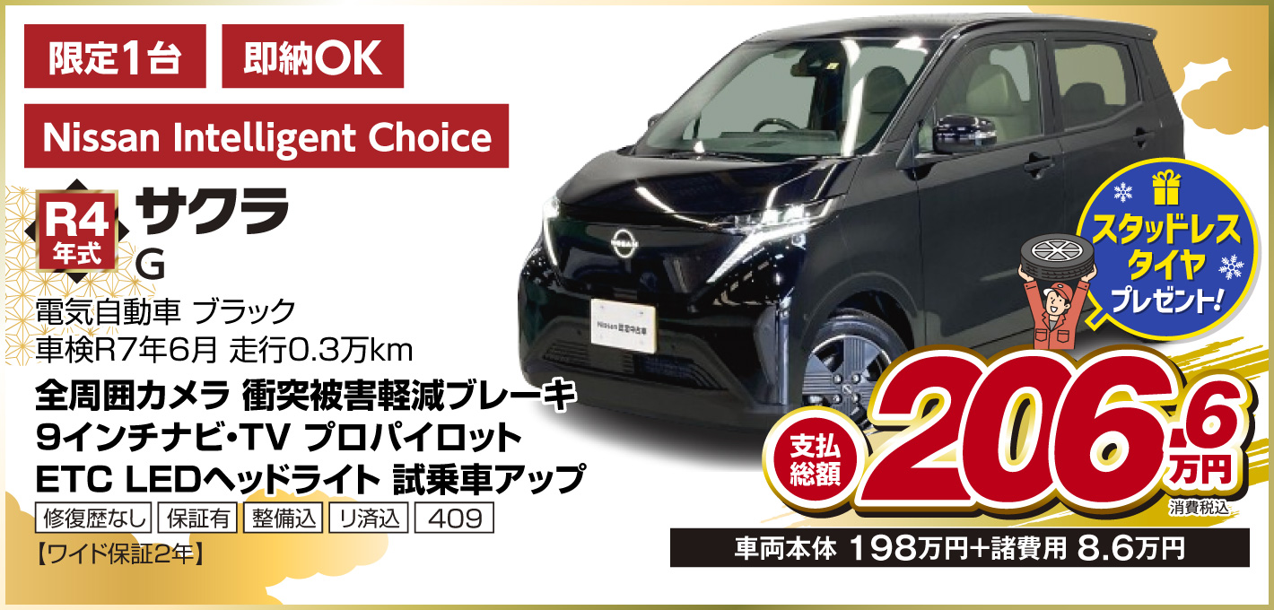 ■支払総額には、車両価格の他・保険料・税金・登録等に伴う費用、リサイクル預託金相当額等、購入時に必要なすべての費用が含まれています。■支払総額は2023年12月現在、県内登録(届出)で店頭納車の場合の価格です。環境性能割等税率変更あった場合、諸費⽤(⽀払総額)は変動する場合がございます。■お客様の要望に基づくオプション等の費用は別途申し受けます。■掲載の車両以外にも展示いたしておりますので、お気軽にお越し下さい。※尚、2023年12月21日(木)現在の在庫車です。WEBページ制作中の売却の節はご容赦下さい。■リサイクル法注記〔リ済込〕リサイクル料金が預託済みで、支払総額に含まれている。■〔整備無〕…定期点検整備を行っていません。〔整備込〕納車時に定期点検整備を実施。整備費用は販売価格に含まれています。■〔保証無〕保証がついていません。〔整備有〕保証がついています。期間は、車両情報と共に記載しています。保証内容につきましては対象外部品がありますので、詳しくは係員にお尋ねください。■表示されている番号は車体番号の下3桁の数です。(例:123)■〔修復歴あり〕修復歴の部位についてはスタッフにお尋ね下さい。〔修復歴なし〕修復歴がありません。■掲載車両の写真は撮影及び表示環境により、実物と異なって見える場合がございます。■十分注意しておりますが、広告に万一ミスがございました節は誠に恐縮ですがご容赦下さい。