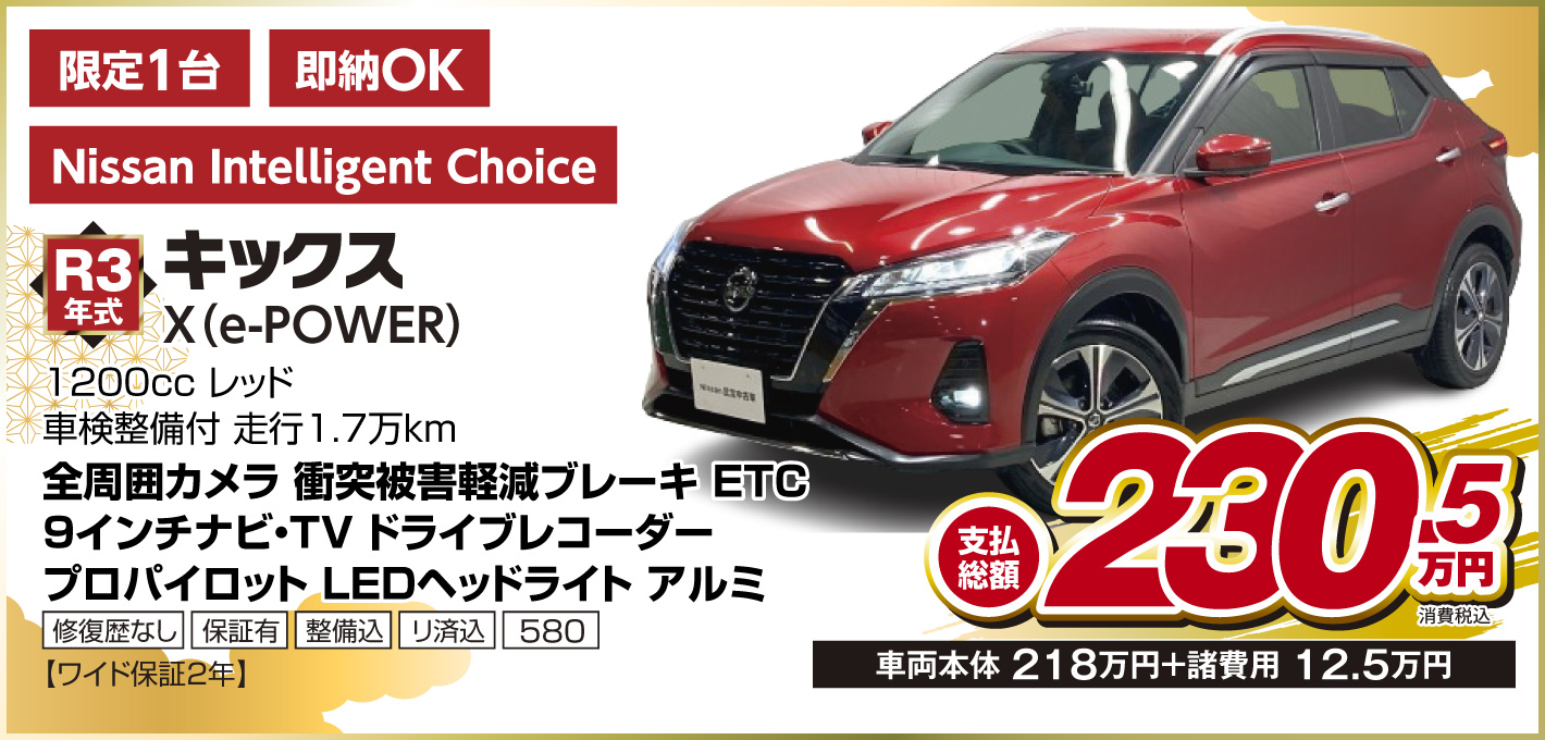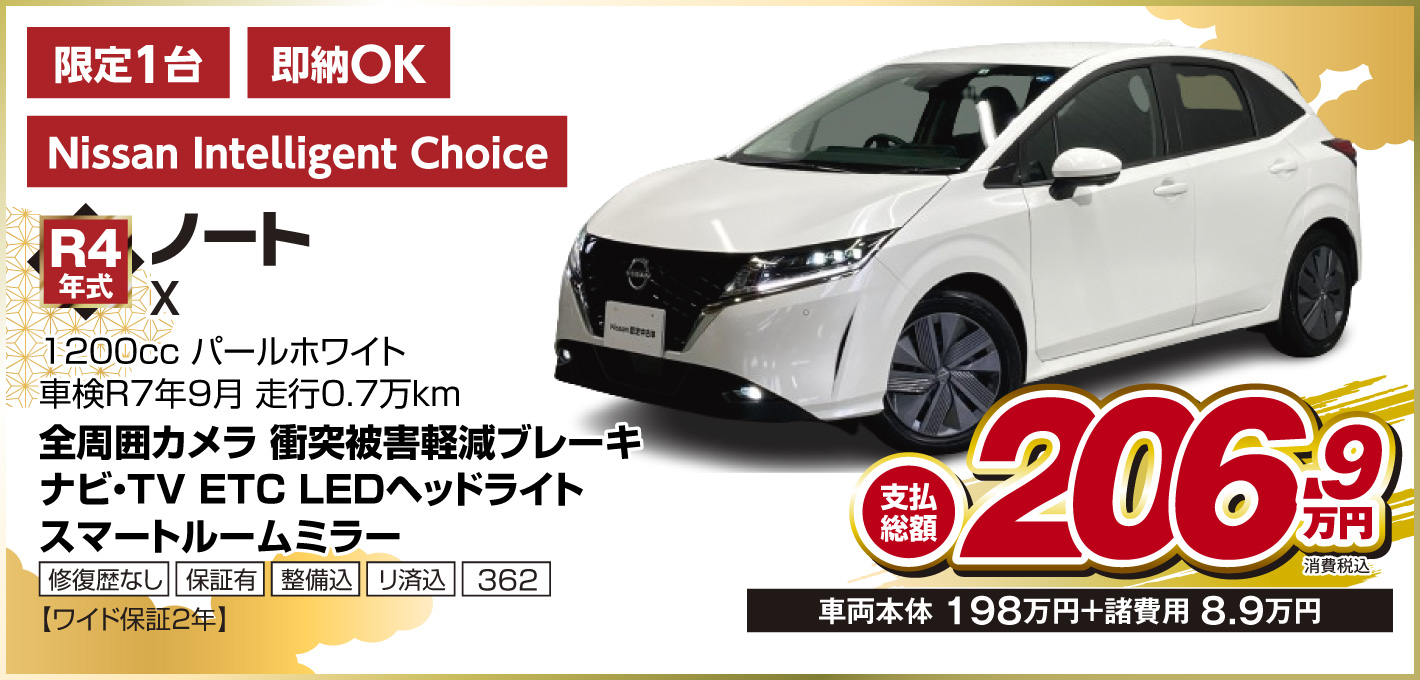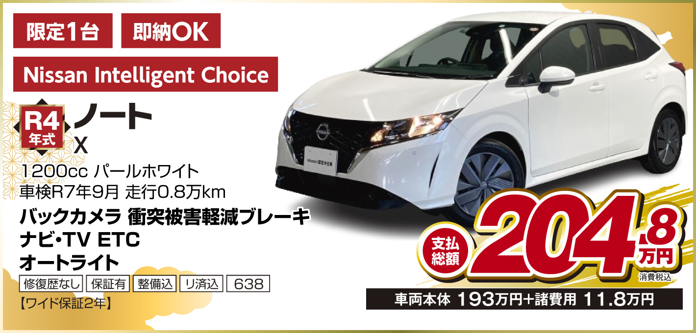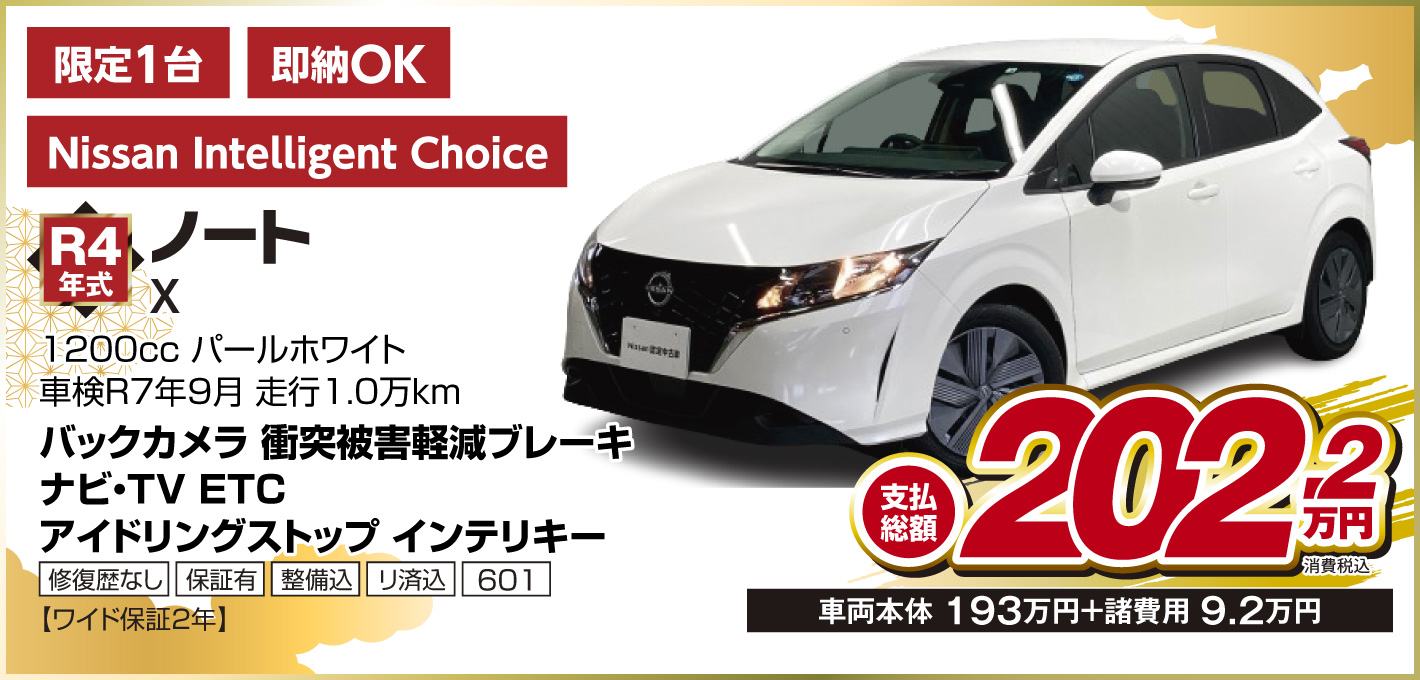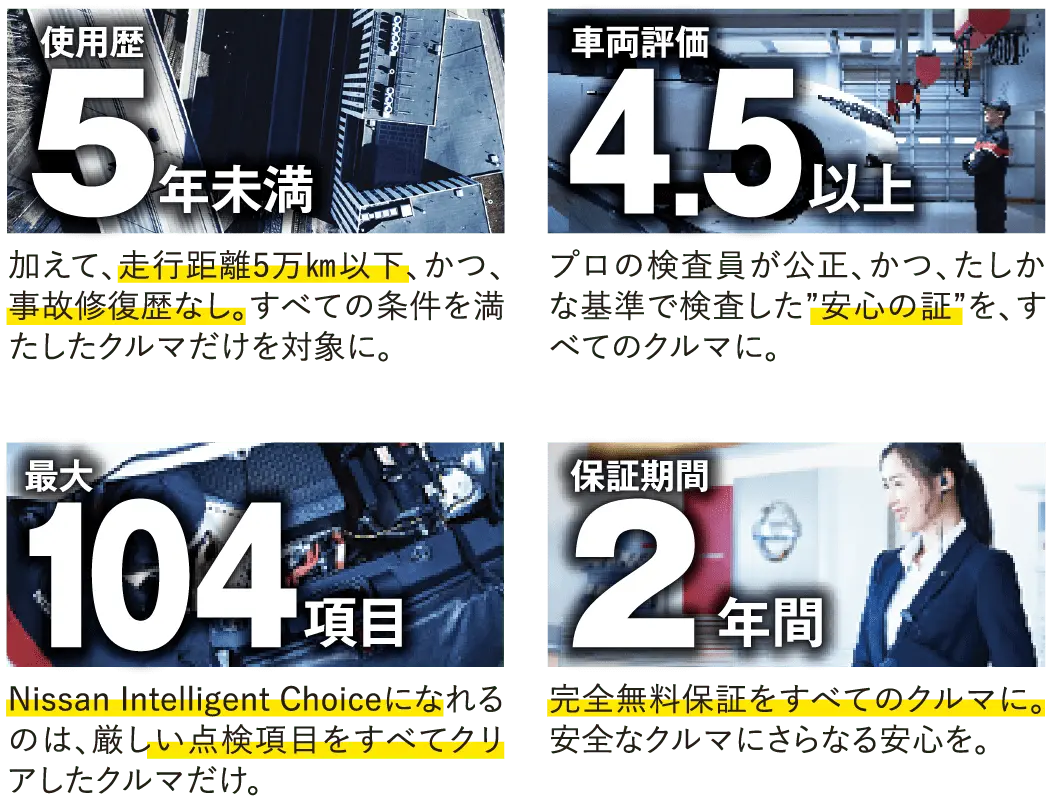 Nissan Intelligence Choice : 初期登録から5年未満かつ走行距離5万Km以下で事故修復歴がなく、プロの検査員が公平かつ確かな基準で検査を実施し、車両状態証明評価4.5点以上を獲得した中古車に表示されます。また、最大104項目にわたる点検整備と、走行距離無制限の2年間無料保証が付きます。