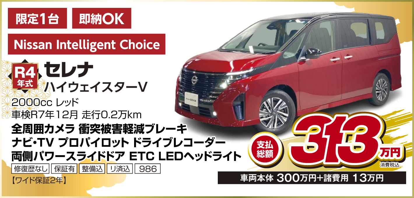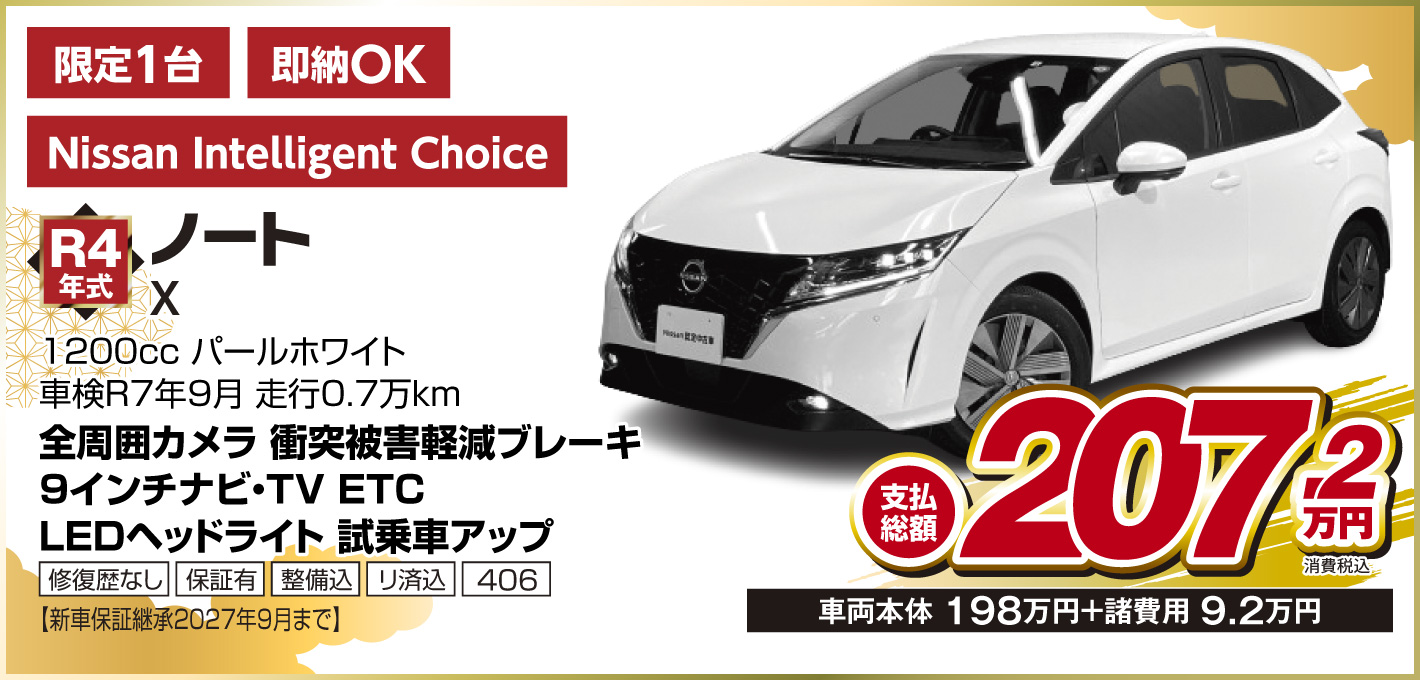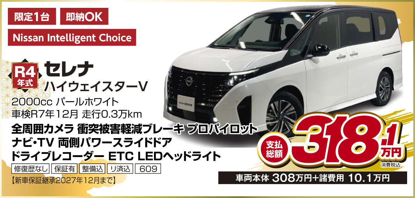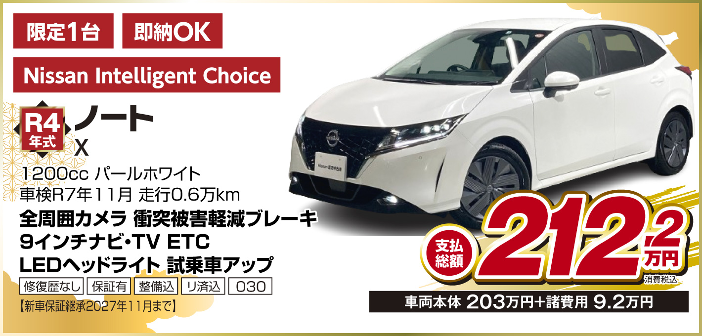 Nissan Intelligence Choice : 初期登録から5年未満かつ走行距離5万Km以下で事故修復歴がなく、プロの検査員が公平かつ確かな基準で検査を実施し、車両状態証明評価4.5点以上を獲得した中古車に表示されます。また、最大104項目にわたる点検整備と、走行距離無制限の2年間無料保証が付きます。