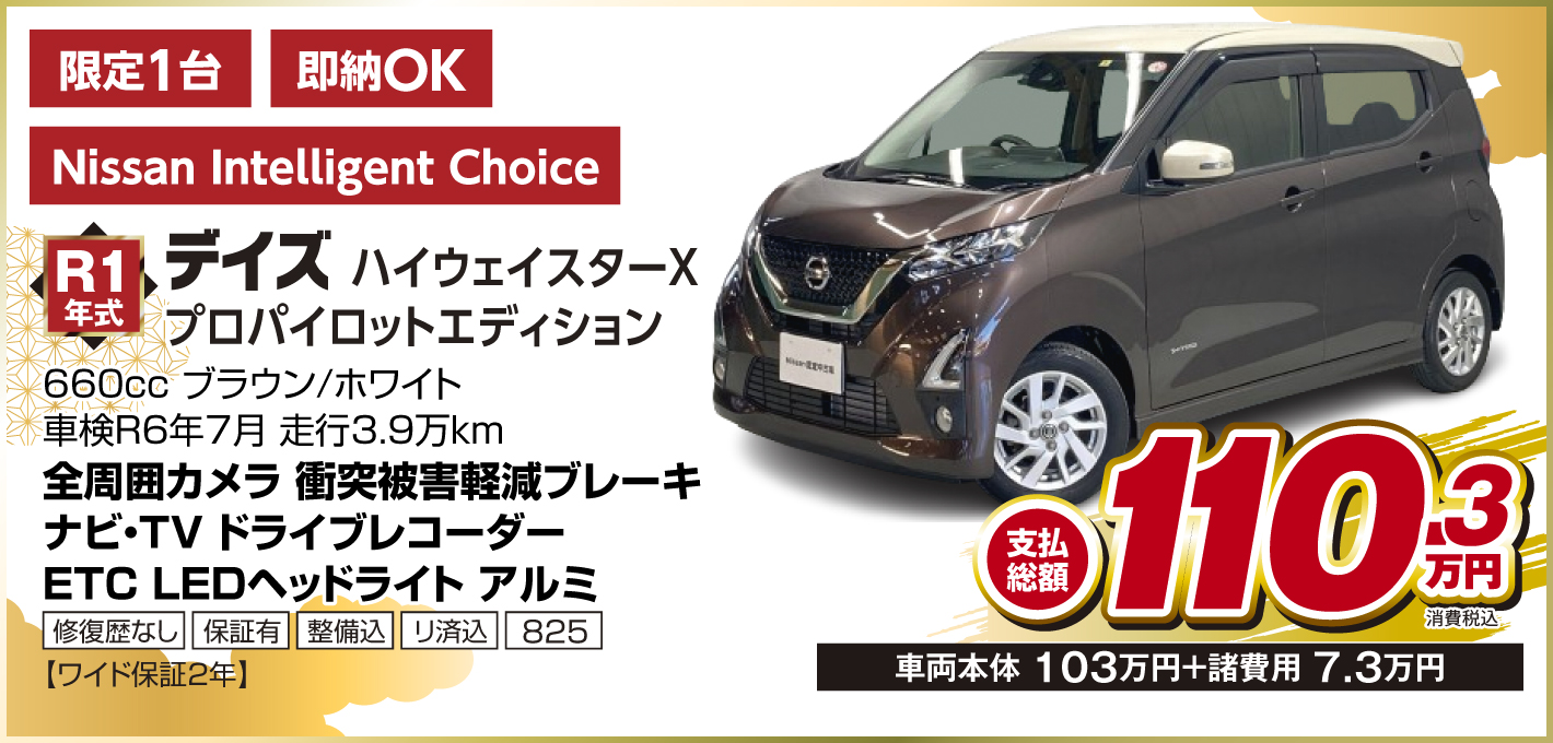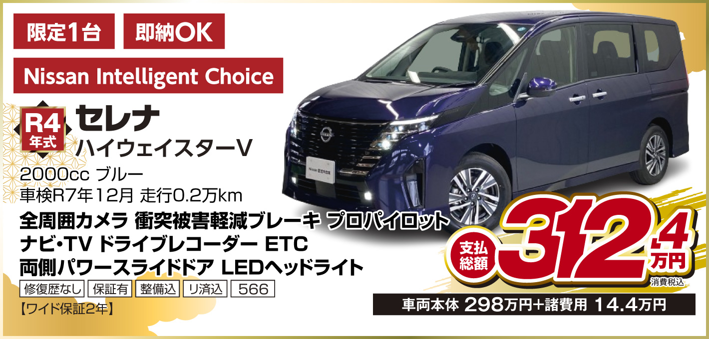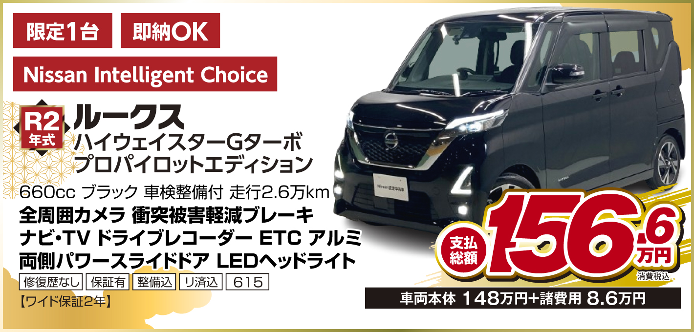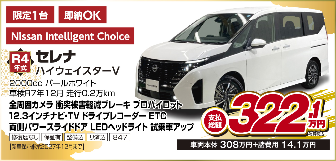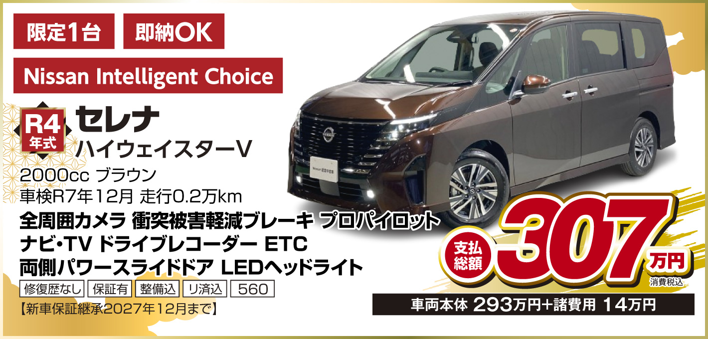 Nissan Intelligence Choice : 初期登録から5年未満かつ走行距離5万Km以下で事故修復歴がなく、プロの検査員が公平かつ確かな基準で検査を実施し、車両状態証明評価4.5点以上を獲得した中古車に表示されます。また、最大104項目にわたる点検整備と、走行距離無制限の2年間無料保証が付きます。