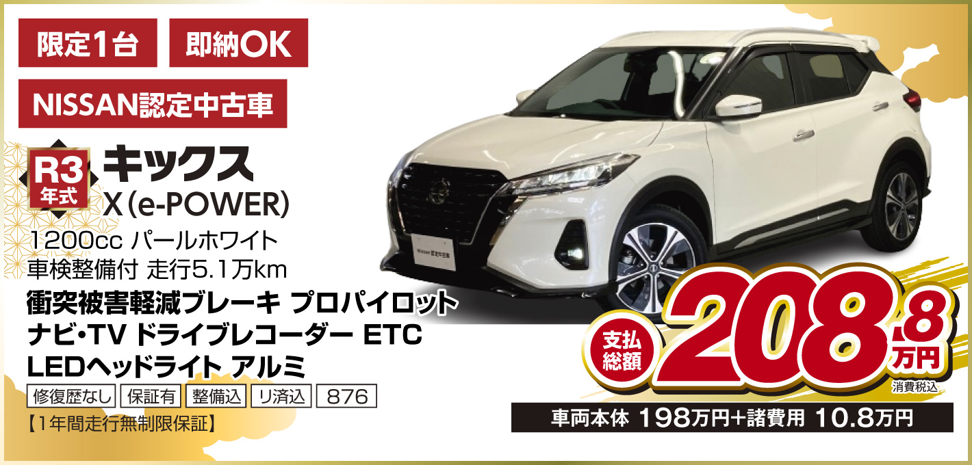 NISSAN認定中古車 : 査定協会公認のプロの検査員が公平かつ確かな基準で検査を実施し、最大104項目にわたる徹底した点検整備を実施。走行距離無制限の1年間無料保証が付きます。